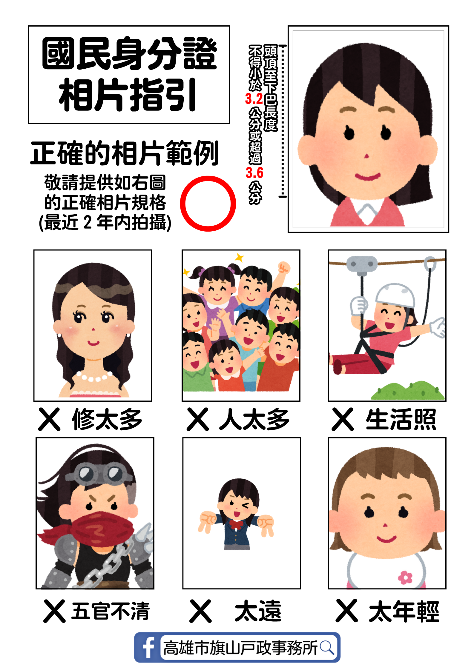 也請切記相片要帶對, 不是 正確規格的相片, 戶政事務所可是不會收的喔~ 背景要白色、五官不能遮住、年齡不能差太多、修圖不能太過度、不能帶有色眼鏡、不要做特殊表情......等等 這些照相細節,照相前都要特別留意 照相前,先來了解正確規格吧~
