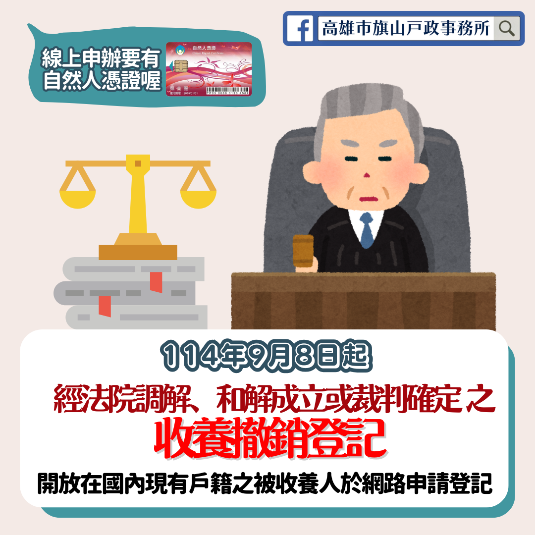 經法院調解、和解成立或裁判確定之收養撤銷登記 114/9/8起開放以自然人憑證於網路申請登記 申請人:在國內設有戶籍之被收養人 申請時間:事件發生或確定後30日內 戶政線上申辦戶籍登記,24小時不打烊 歡迎多加利用