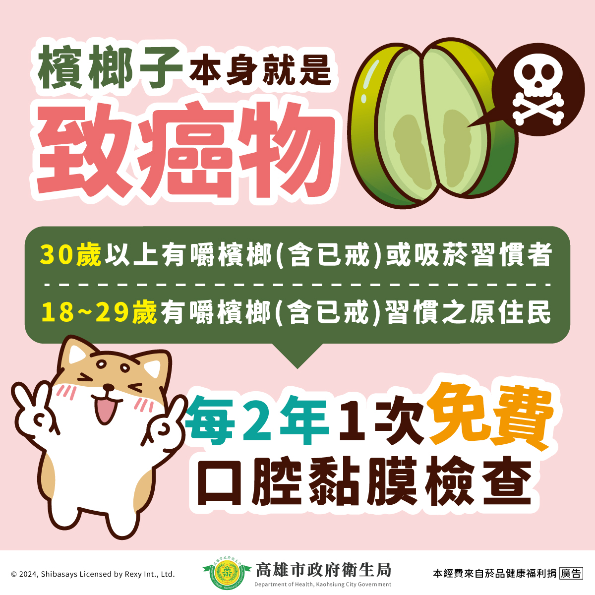 定期篩檢:每2年可免費做1次口腔黏膜檢查! 30歲以上有嚼檳榔(含已戒)或吸菸習慣的民眾 18歲以上有嚼檳榔(含已戒)的原住民朋友